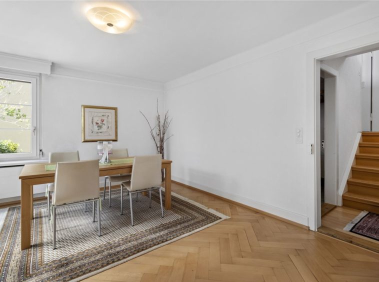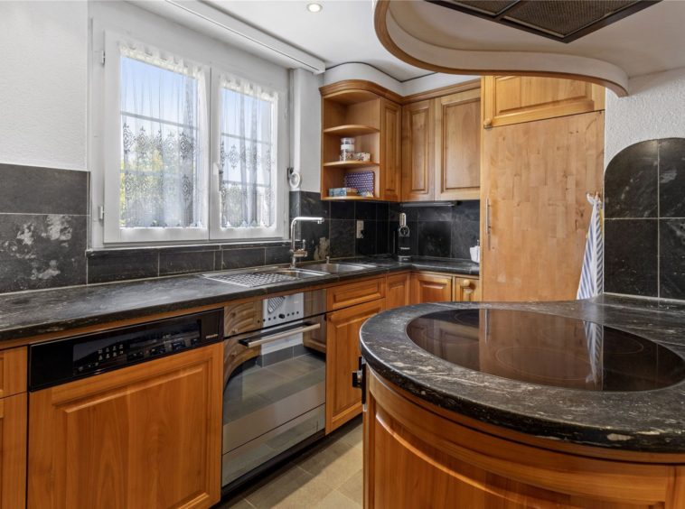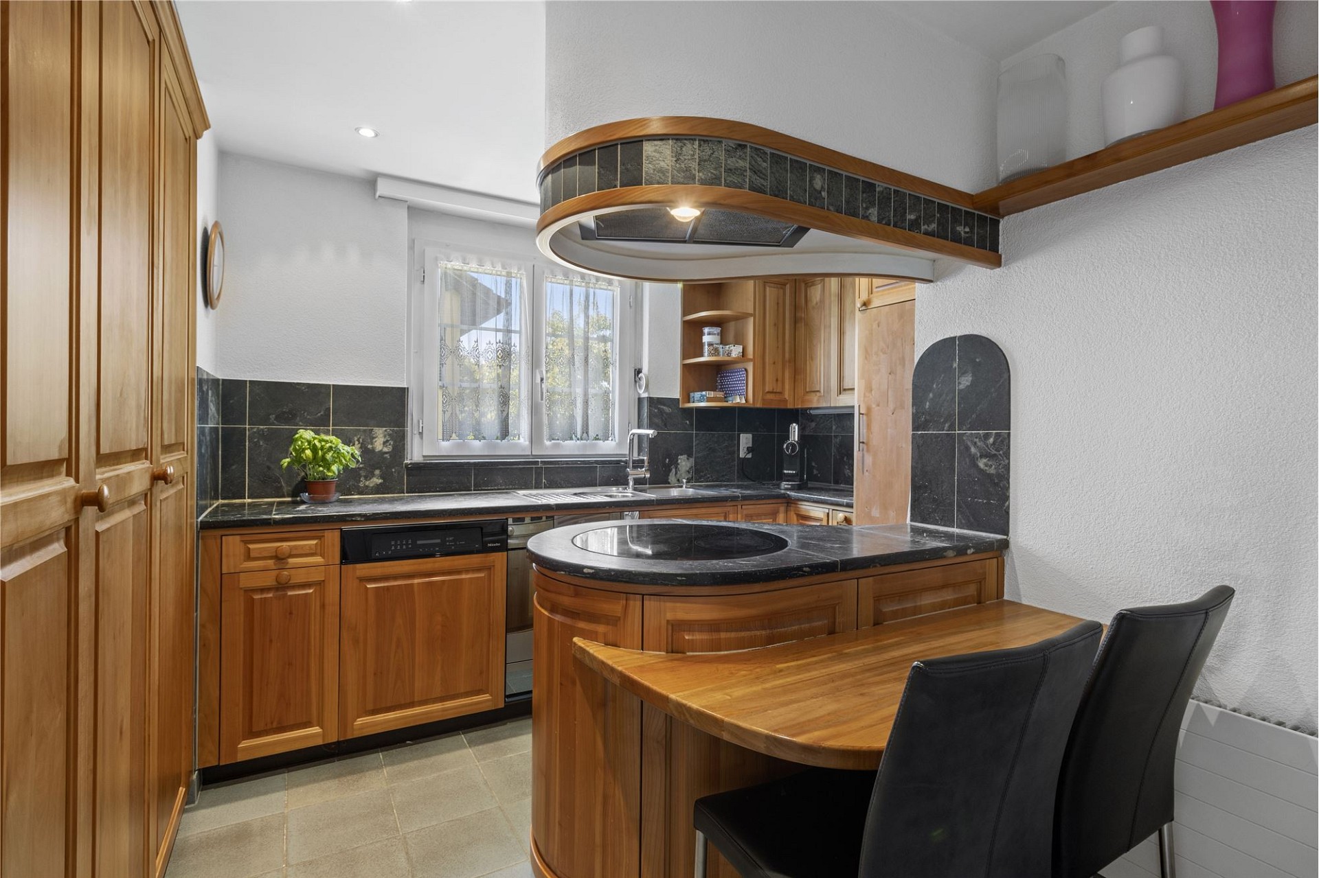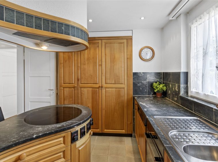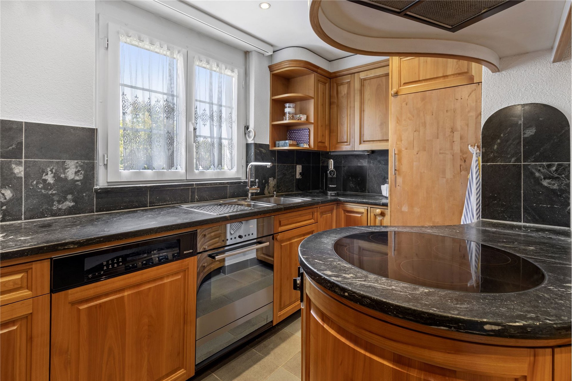 Im Erdgeschoss empfängt Sie ein geräumiges Wohn- und Esszimmer mit direktem Ausgang in den Garten – die grossen Fenster holen Licht und Grün ins Haus und schaffen ein behagliches Wohngefühl. Herzstück ist die aussergewöhnliche Küche mit Kochinsel und robuster Natursteinabdeckung, die Funktionalität und Stil vereint; hier wird Kochen zum Vergnügen. Ebenfalls auf dieser Ebene befindet sich ein einladendes Gästezimmer. Einbruchhemmende Rollläden im Erdgeschoss erhöhen Komfort und Sicherheit; eine praktische Gästetoilette liegt im Halbstock in unmittelbarer Nähe des Treppenhauses.