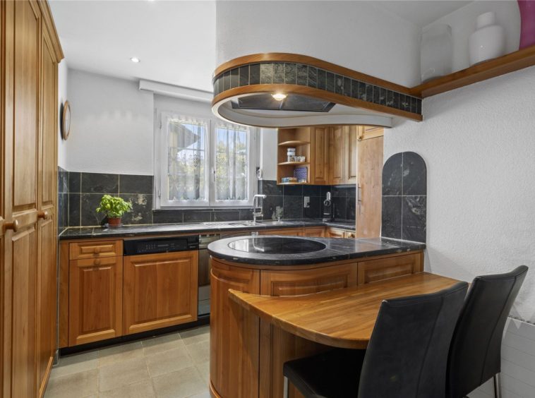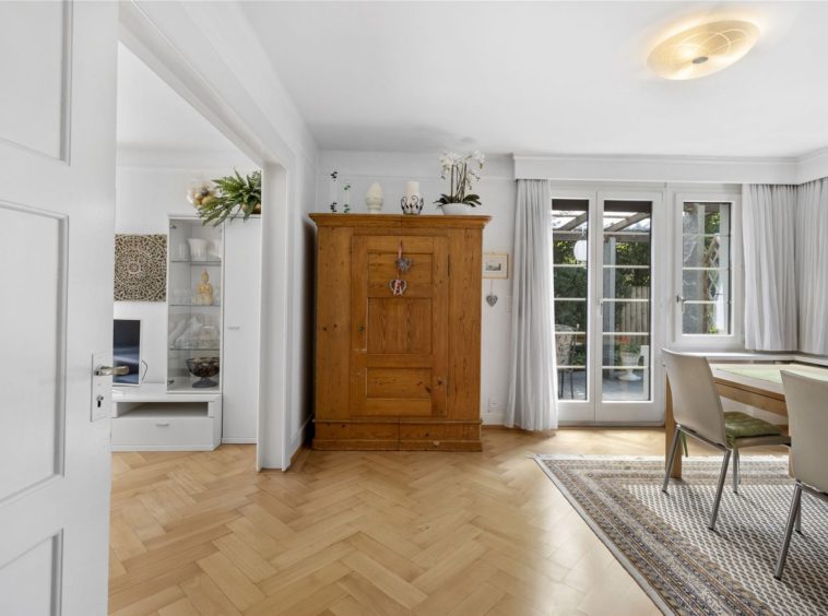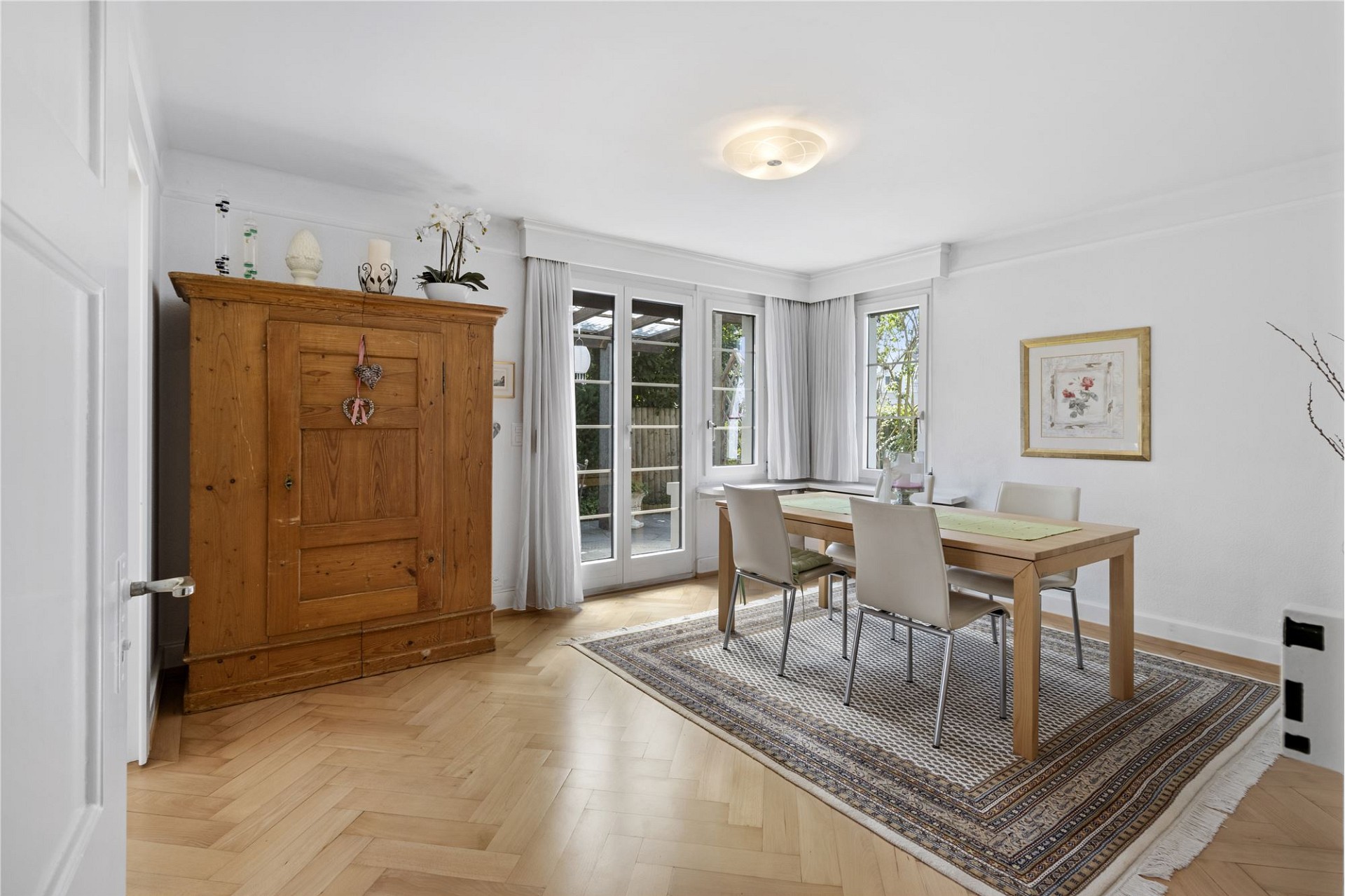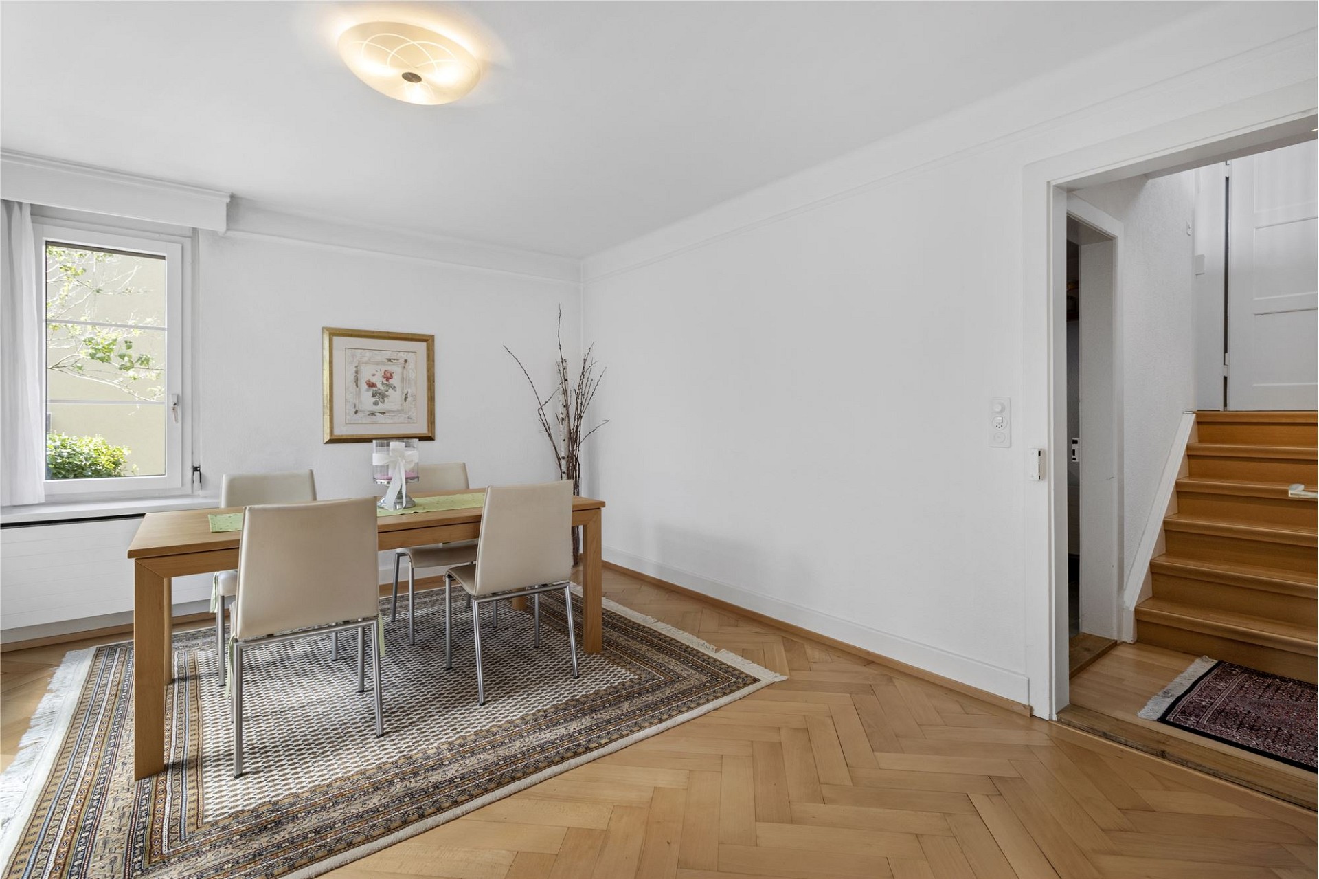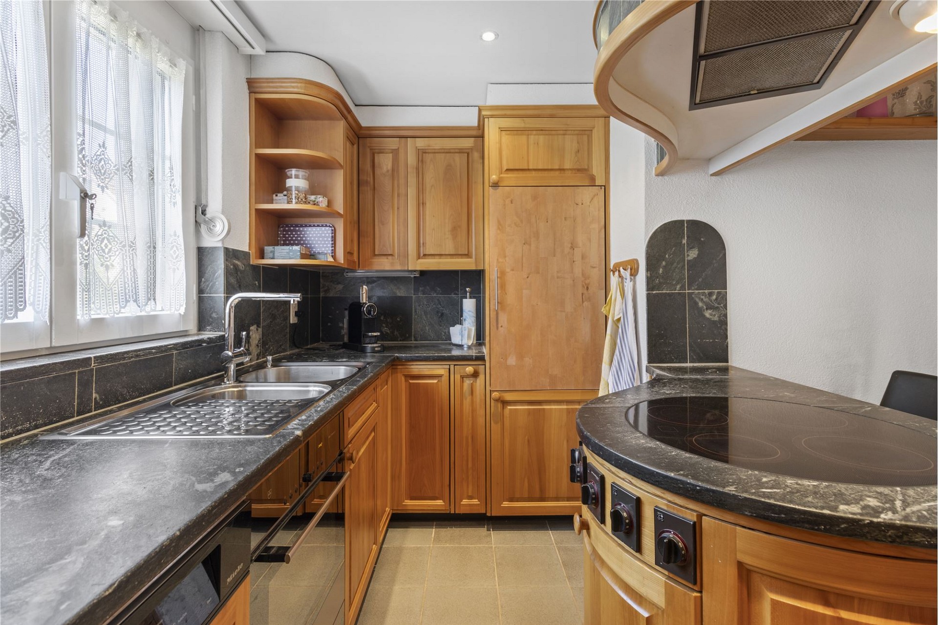 Im Erdgeschoss empfängt Sie ein geräumiges Wohn- und Esszimmer mit direktem Ausgang in den Garten – die grossen Fenster holen Licht und Grün ins Haus und schaffen ein behagliches Wohngefühl. Herzstück ist die aussergewöhnliche Küche mit Kochinsel und robuster Natursteinabdeckung, die Funktionalität und Stil vereint; hier wird Kochen zum Vergnügen. Ebenfalls auf dieser Ebene befindet sich ein einladendes Gästezimmer. Einbruchhemmende Rollläden im Erdgeschoss erhöhen Komfort und Sicherheit; eine praktische Gästetoilette liegt im Halbstock in unmittelbarer Nähe des Treppenhauses.