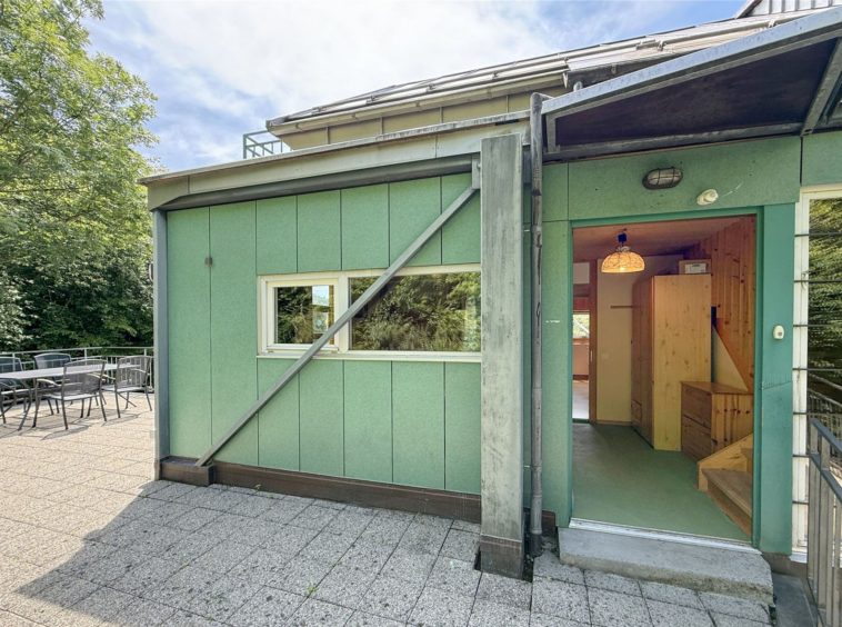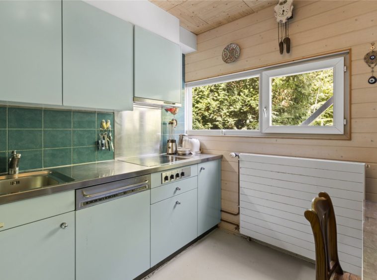 Vom Erdgeschoss führt eine solide Holztreppe ins Obergeschoss. Alternativ gelangt man über den zweiten Eingang, der sich seitlich über eine Aussentreppe erschliesst, direkt zur grossen Terrasse und zur Hauptebene des Hauses. Diese Wohnetage bietet ein Schlafzimmer, ein grosses Wohnzimmer, eine gepflegte Küche und ein Esszimmer, sowie ein Bad mit Dusche und WC.