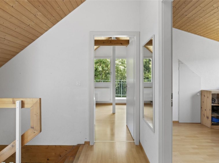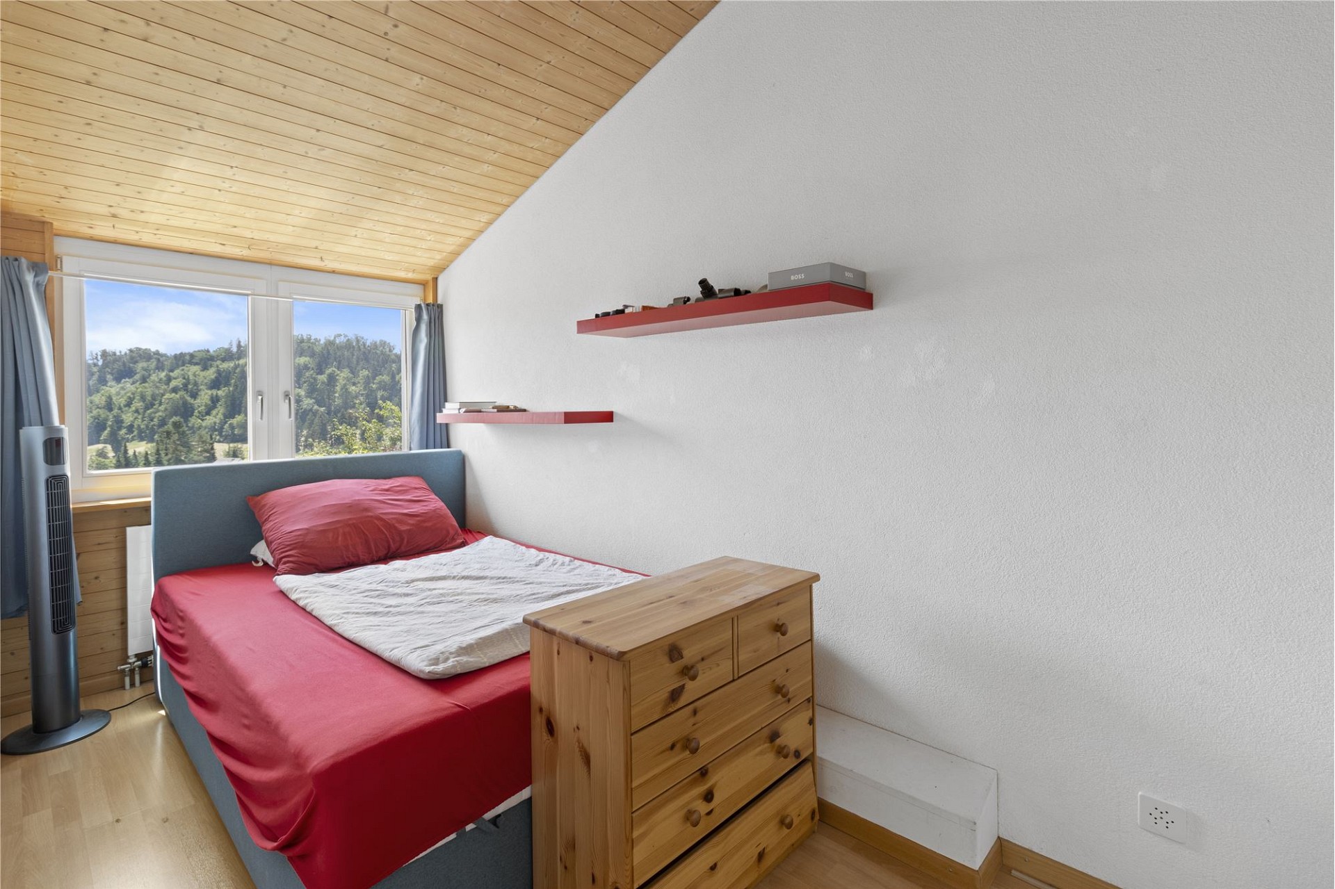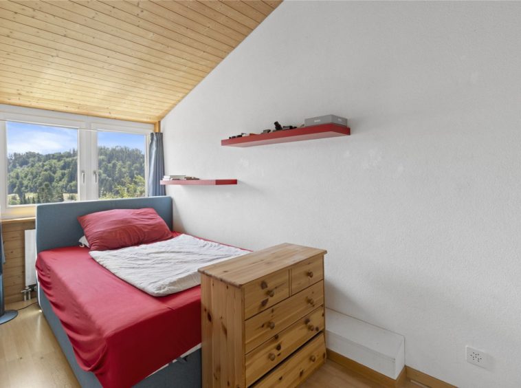 Vom Obergeschoss aus führt eine Holztreppe weiter ins Dachgeschoss, wo sich zwei weitere Schlafzimmer und ein Wohnzimmer befinden. Eines davon verfügt über einen Balkon mit herrlicher Aussicht auf die umliegende Berglandschaft – ein wunderbarer Ort, um die Ruhe der Umgebung zu geniessen.