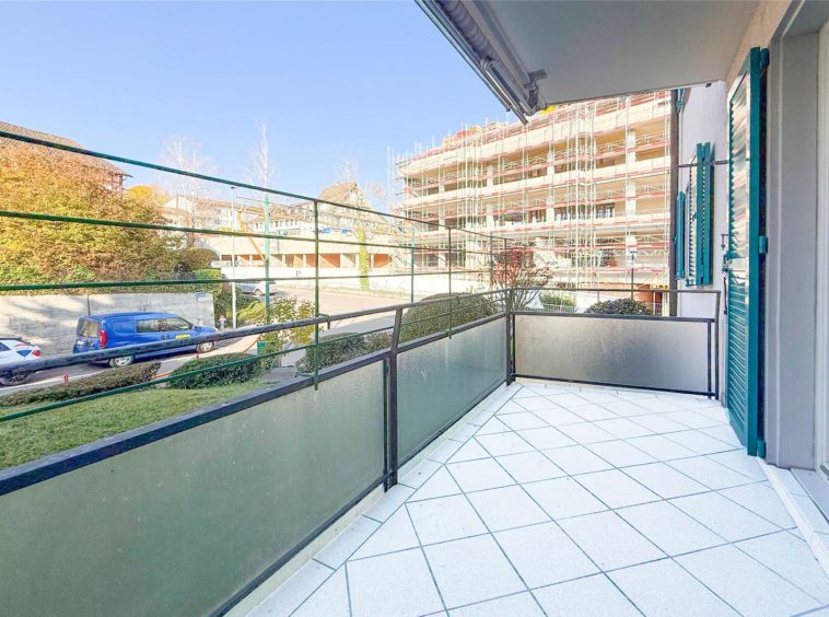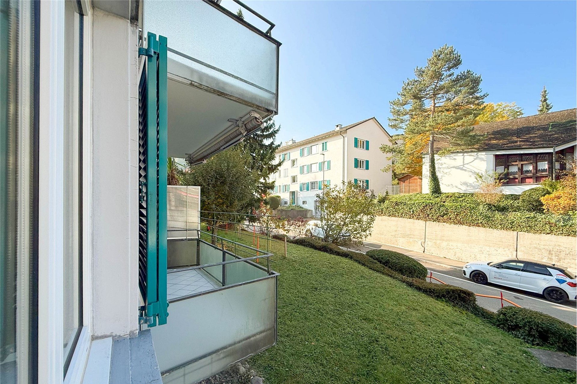 Vom Wohnzimmer aus gelangen Sie direkt auf den sonnigen Balkon mit Bodenplatten – der perfekte Ort, um den Feierabend oder das Wochenende in Ruhe zu geniessen.